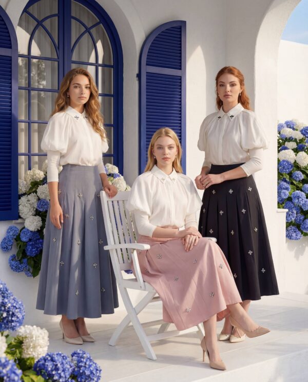 סט שתי חל' חצאית קפלים ואבנים וחולצה עם אבנים בקצה הצוארון .אופנתי מאד! בעל גזרה מושלמת, מלא מלא שיק !!!
