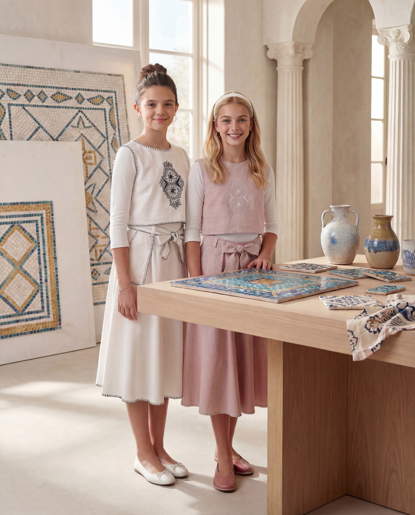 שתי חל' לבן עם רקמה באפודה וחגורה וסיומות תכים כחולים.